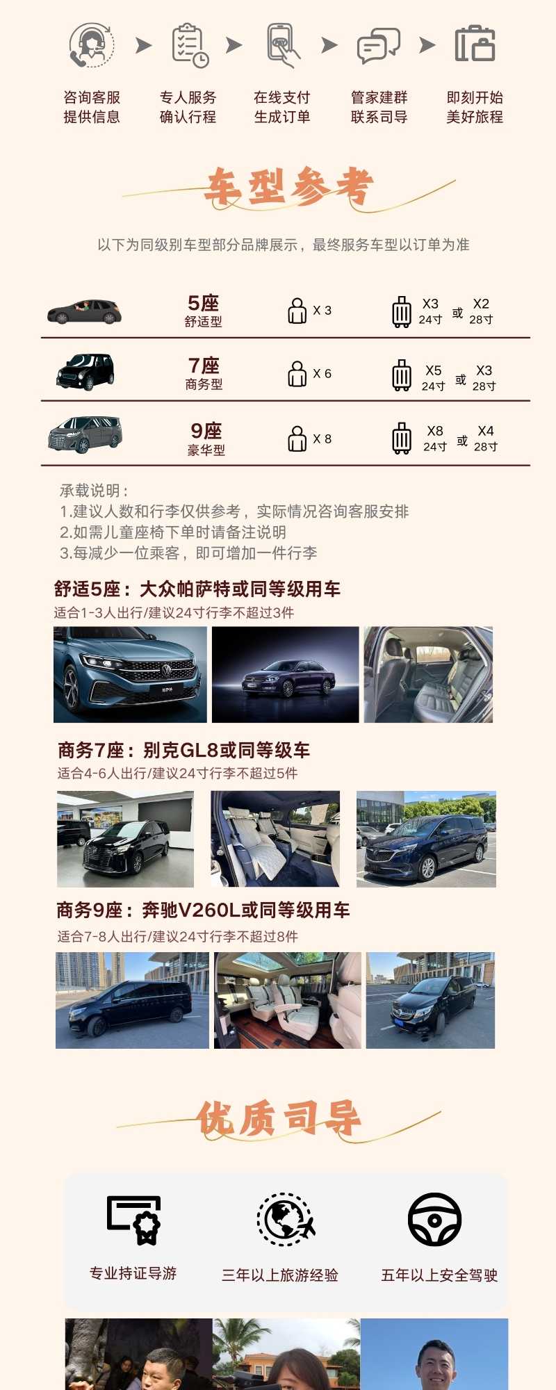 1、车辆:第一/二/三/四/五天的行程用车,含接送站/过路费/油费/停车费/司机食宿等; 2-5人安排7座商务车、6-7人安排9座商务车,保证空座率。