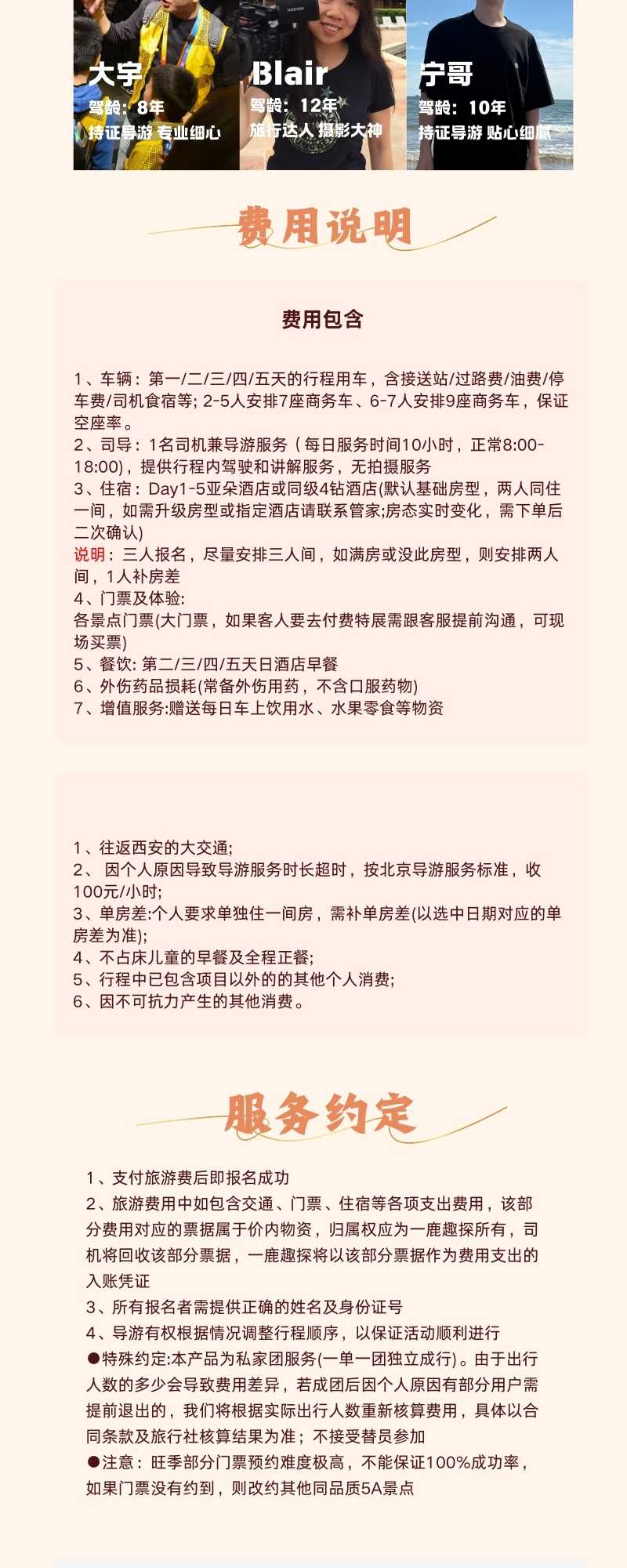 2、司导:1名司机兼导游服务(每日服务时间10小时,正常8:00-18:00),提供行程内驾驶和讲解服务,无拍摄服务